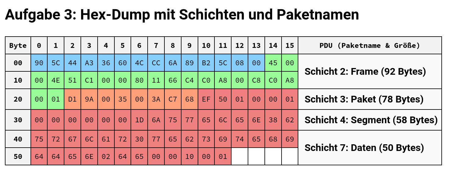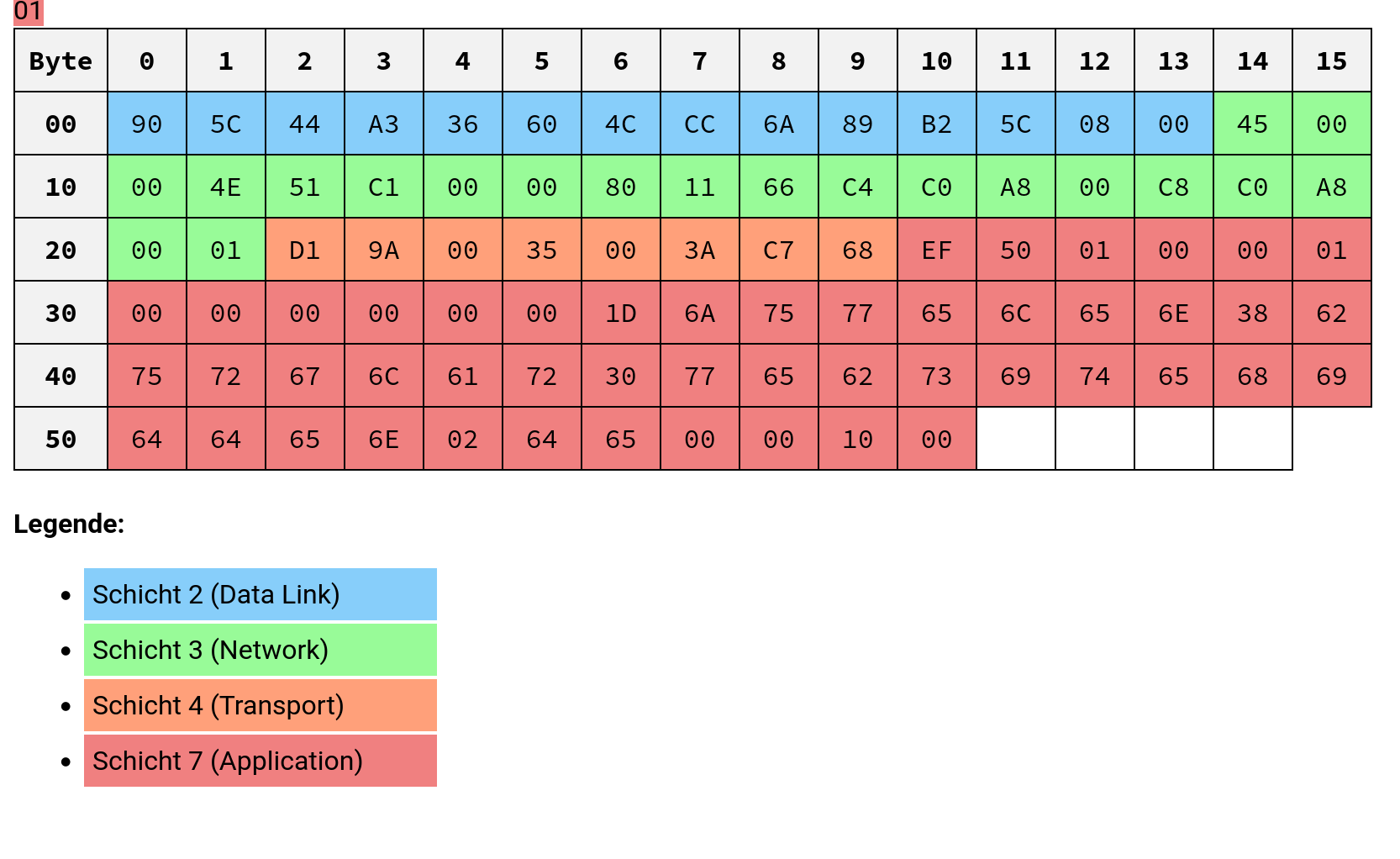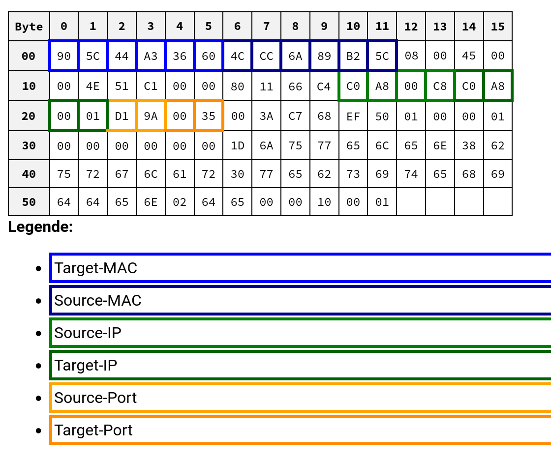 → Jeder farbige Bereich / Header wird von einem Protokoll gelesen / verstanden!1 → Die Länge und Verwendung der Eeinzelnen Bits/Bytes ist unveränderbar festgeschrieben! → Ausnahme ist natürlich der Datenbereich, dessen Inhalt und Größe variabel sein muss!
